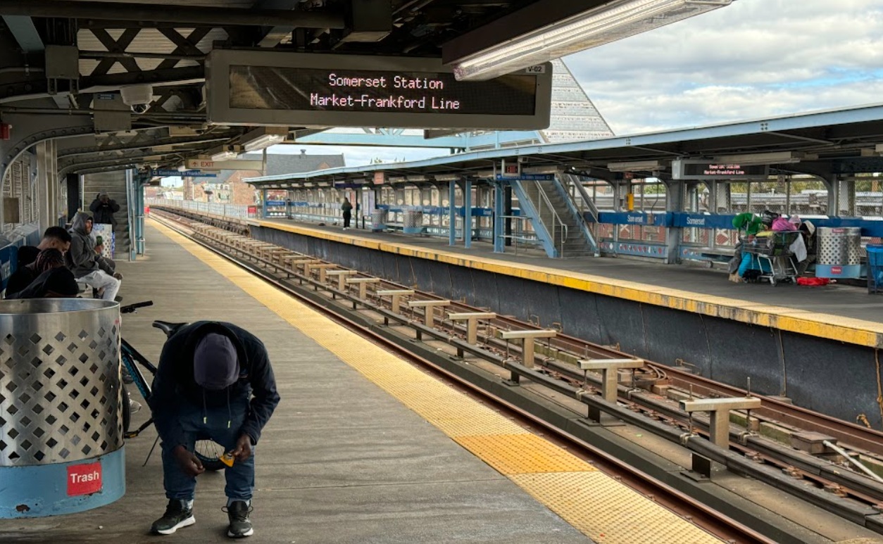 Un hombre desplomado mientras los pasajeros esperan el tren en la estación Somerset, en el barrio de Kensington, lleno de drogas, de Filadelfia. Crédito: Sergio Chapa | Cortesía