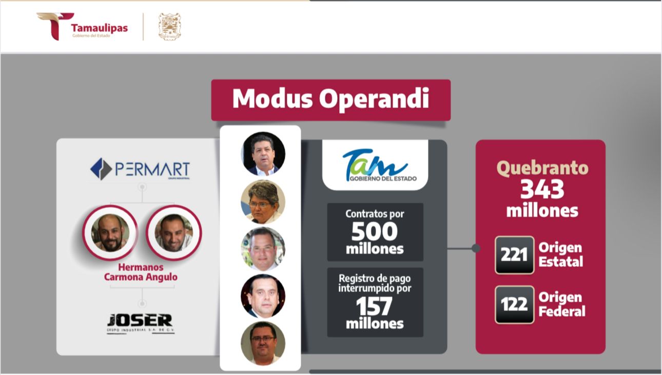 El director jurídico de la Secretaría de Salud de Tamaulipas, Iván Saldaña Magaña, confirmó que se presentaron 70 denuncias, de las cuales, 14 con del orden penal que incluyen al exgobernador de Tamaulipas, Francisco García Cabeza de Vaca por un quebranto de más de 343 millones de pesos al erario por contratos con los hermanos Carmona.