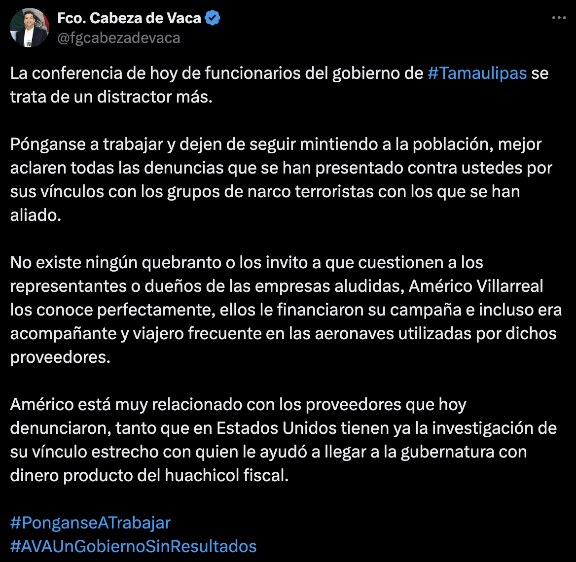 Después de que se dieran a conocer las denuncias por parte del Gobierno de Tamaulipas contra el exgobernador Francisco García Cabeza de Vaca, el exmandatario, a través de redes sociales, evadió su responsabilidad en el desfalco millonario.
