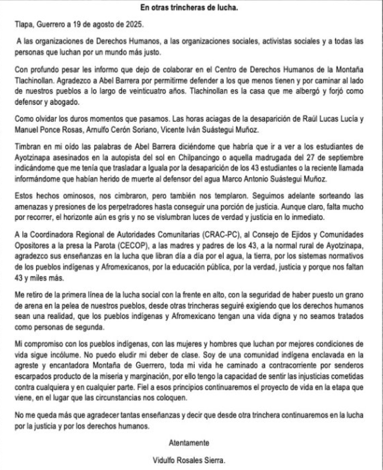 A un mes de cumplirse 11 años del crimen, su salida marca un cambio significativo en la representación legal de los padres y madres de los normalistas.En un comunicado titulado «En otras trincheras de lucha», Rosales expresó su agradecimiento a las familias, a la Normal Rural de Ayotzinapa y a organizaciones como la Coordinadora Regional de Autoridades Comunitarias (CRAC-PC) y el Consejo de Ejidos y Comunidades Opositores a la presa La Parota (CECOP). “Fiel a esos principios continuaremos el proyecto de vida en la etapa que viene, en el lugar que las circunstancias nos coloquen”, escribió, destacando su compromiso con la justicia y los derechos humanos desde una nueva posición.