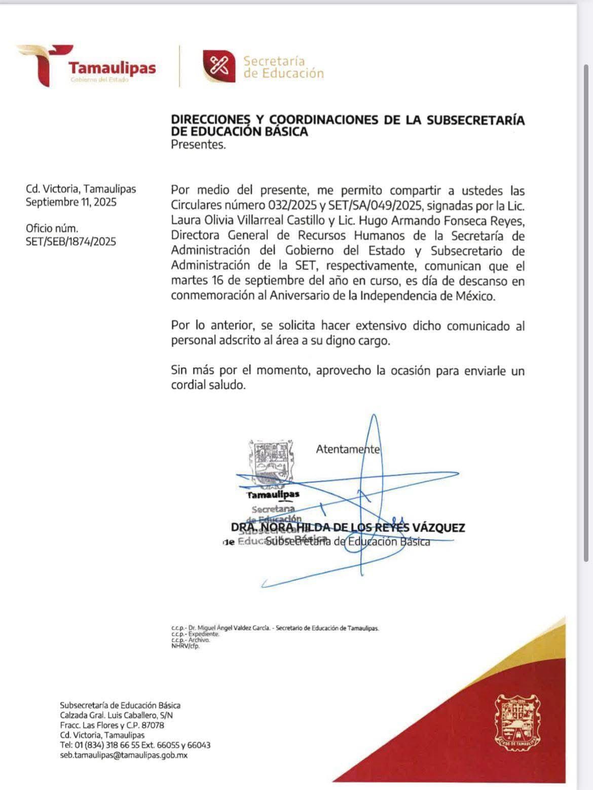 “Aprovecho para invitar tanto alumnos como maestros y padres de familia a participar y presenciar el desfile conmemorativo por el 215 aniversario del inicio de la Independencia de México, que presidirá el gobernador del estado, doctor Américo Villarreal Anaya”, finalizó Valdez García.