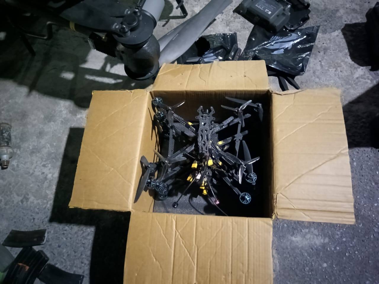 En un comunicado, se dio a conocer que a detenido se le decomisaron dos armas de fuego, 26 cargadores, 44 cartuchos, 151 objetos explosivos, 18 drones, un detector de drones, tres antidrones y dos artefactos explosivos improvisados.