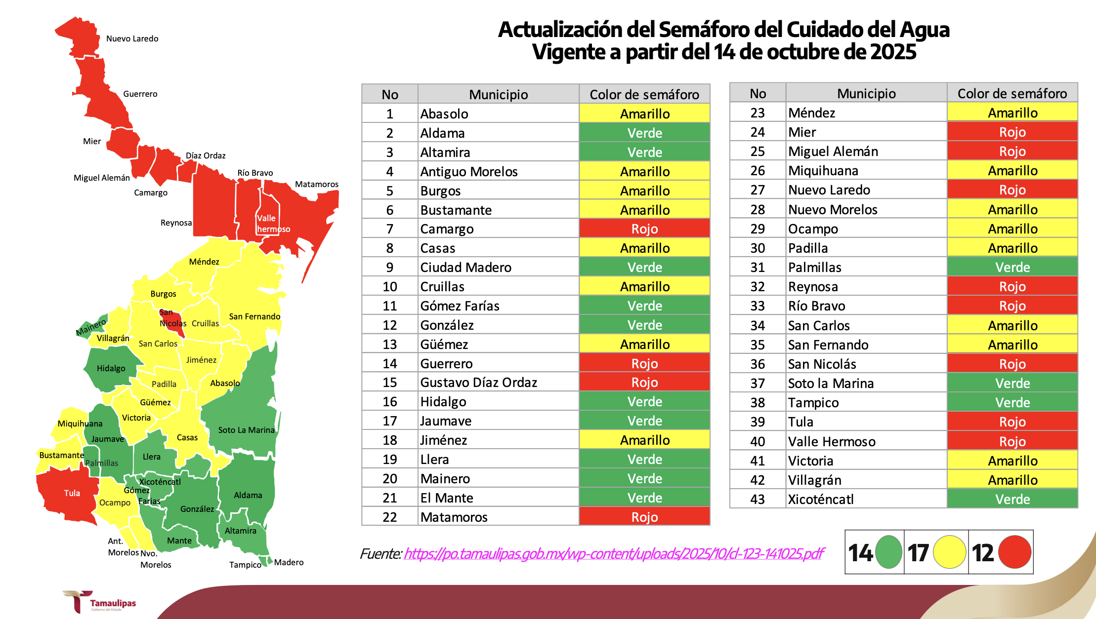 La presidenta de la Comisión de Recursos Hidráulicos en el Congreso local, Elvia Eguía Castillo, advirtió que la cuenca del Río Bravo se encuentra en estado crítico, con los municipios de Nuevo Laredo, Guerrero, Mier, Miguel Alemán, Camargo, Díaz Ordaz, Reynosa, Río Bravo, Valle Hermoso y Matamoros en color rojo, debido a un marcado déficit hídrico en los vasos de almacenamiento.