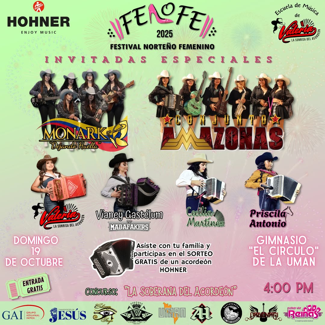 El 19 de octubre de 2025 fue la gran fiesta del acordeón norteño femenino. Un encuentro binacional de colorido, música, alegría y belleza con las mejores acordeonistas que llegaron de diferentes ciudades del país. Esto nos lleva a reflexionar que la música no tiene fronteras, sino un espacio cultural donde todos nos damos la mano para fortalecer nuestra cultura. Con invitadas especiales Monark Dejando Huella, Valeria La Sonrisa del Acordeón, Amazonas, Vianey Gastelum, Cecilia Martínez y Priscila Antonio.
