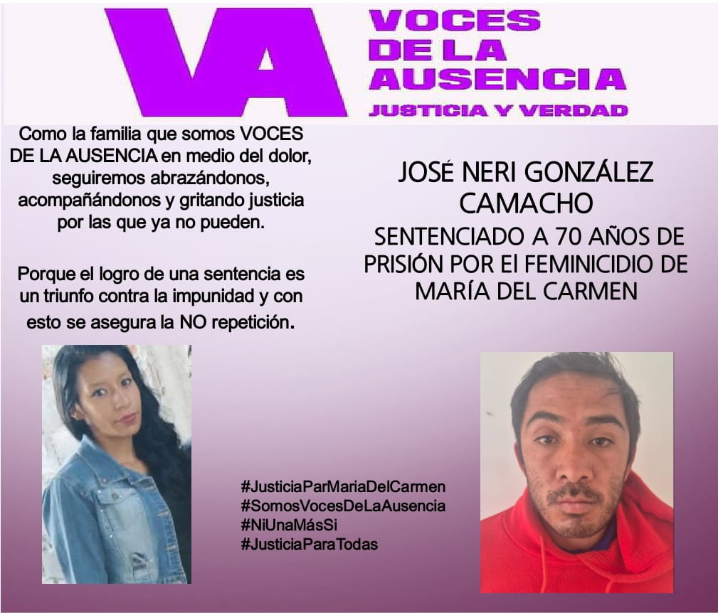 Fue hasta el 21 de marzo del 2025 que José Neri fue aprehendido y vinculado a proceso el 26 de marzo del mismo año. Por fin este 19 de enero del 2026, José Neri G fue sentenciado a 70 años de prisión por el feminicidio de María del Carmen.