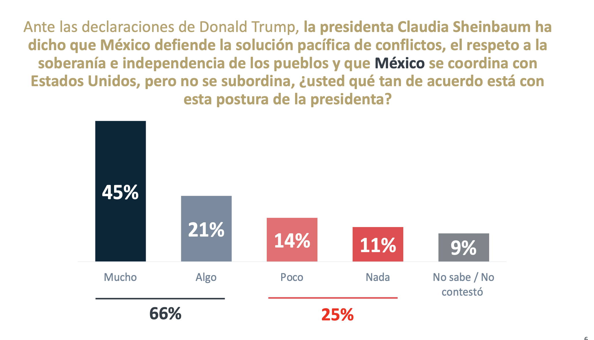 «Ante las declaraciones de Donald Trump, la Presidenta Claudia Sheinbaum ha dicho que México defiende la solución pacífica de conflictos, el respeto a la soberanía e independencia de los pueblos, y que México se coordina con Estados Unidos, pero no se subordina, ¿usted qué tan de acuerdo está con esta postura de la Presidenta?».