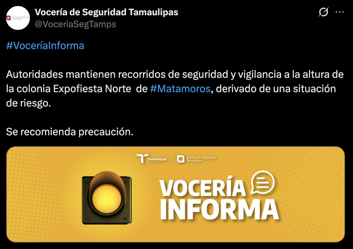 Por su parte, la Vocería de Seguridad de Tamaulipas confirmó durante la madrugada de este 12 de febrero que realizaban recorridos de vigilancia por la situación de riesgo en Matamoros.