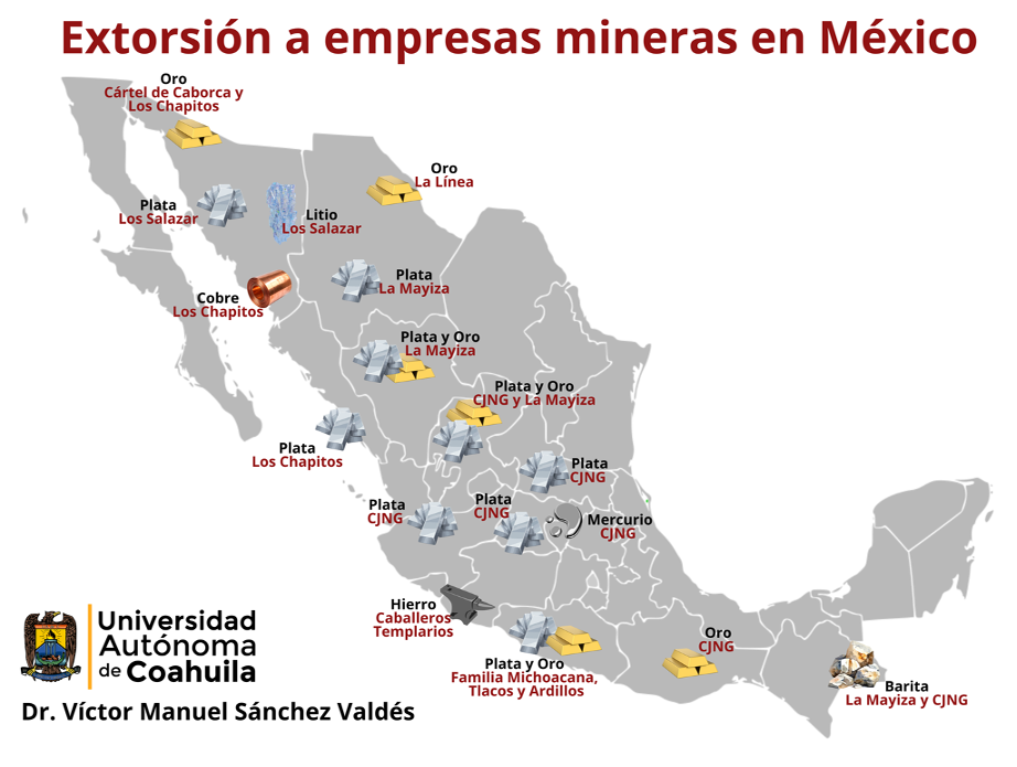Hay dos grandes franjas mineras altamente productivas en México, una que abarca Sonora, Chihuahua, Durango, Zacatecas y Sinaloa, la cual es disputada por las dos facciones del Cártel de Sinaloa, los Chapitos y la Mayiza, así por el CJNG y algunas organizaciones locales como el Cártel Independiente de Sonora (Los Salazar) y el Cártel de Caborca.