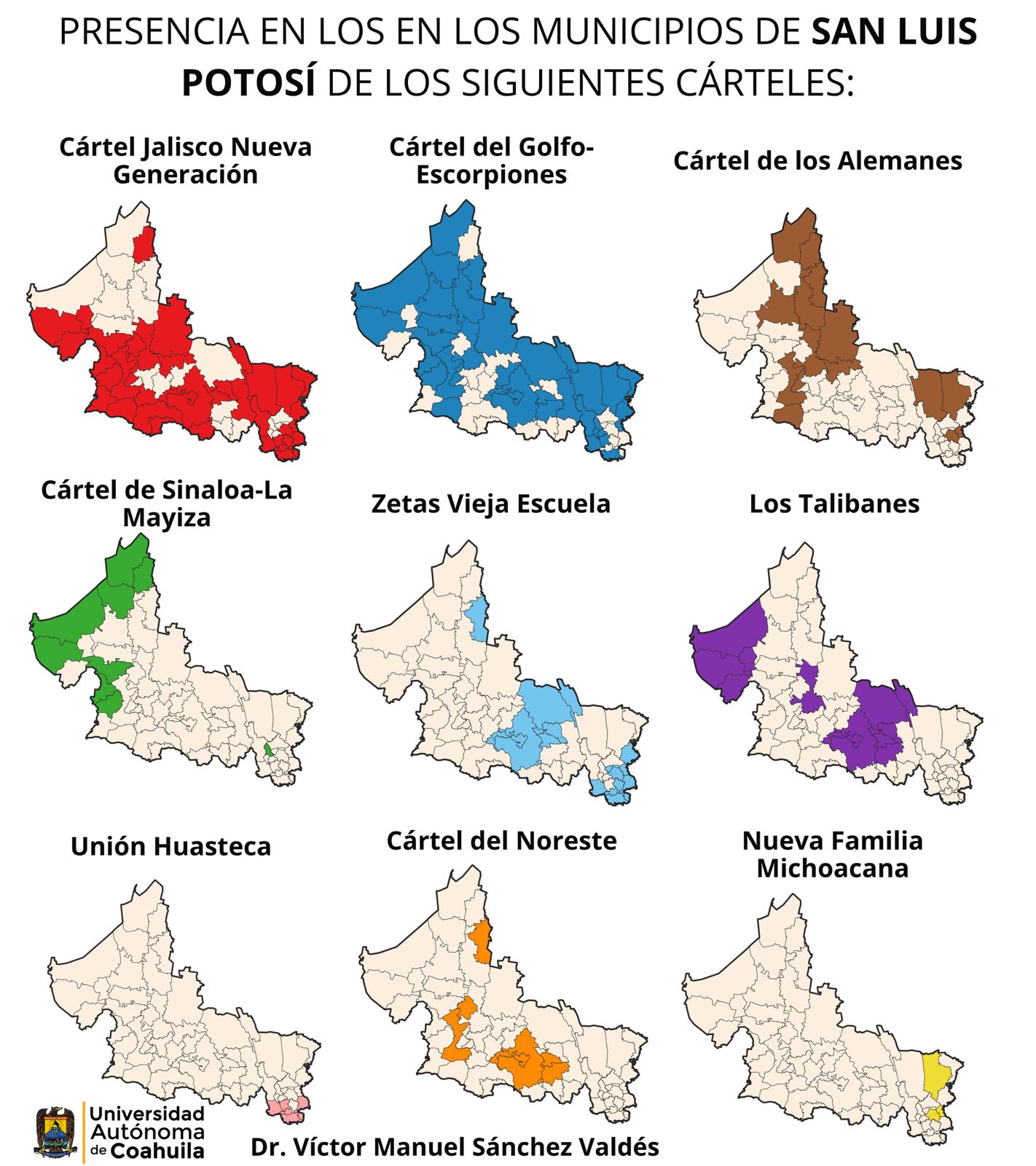 Hay otras dos organizaciones que se derivan de los Zetas, las cuales ya fueron mencionadas, la primera es los Talibanes, que se crearon cuando en 2013, cuando Iván Velázquez Caballero “El Talibán”, quien era el líder regional en San Luis Potosí, rompió con los Zetas para formar una banda de corte local que se volvió con el tiempo aliada del Cártel del Golfo y aunque ha perdido fuerza con los años, aún mantiene presencia en 11 municipios y la segunda es el Cártel del Noreste, con presencia en 7 municipios.