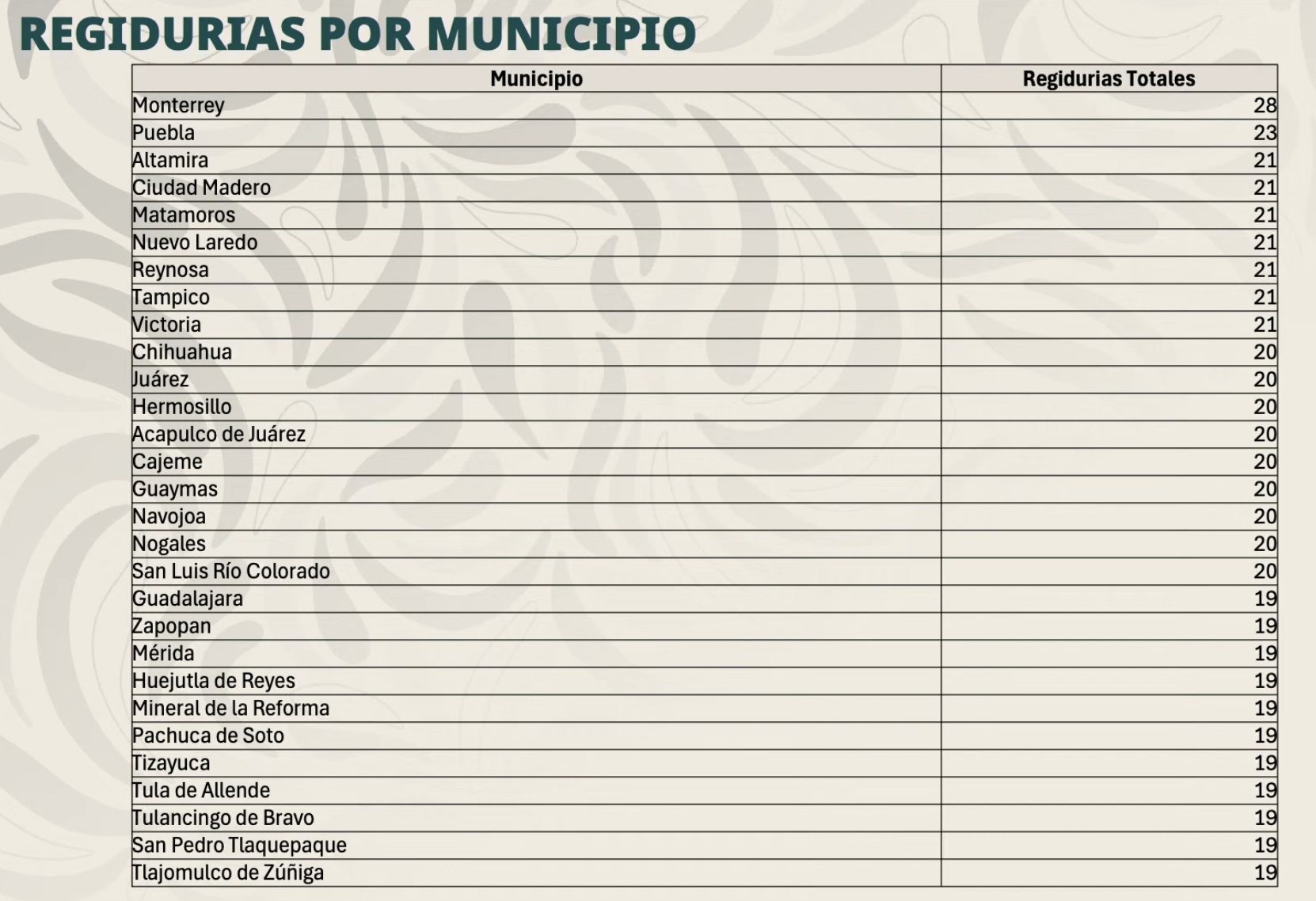 En una tabla que difundió aparecen siete municipios de Tamaulipas los cuales cuentan con 21 regidores. Estos son: Ciudad Madero, Tampico, Altamira, Matamoros, Nuevo Laredo, Reynosa y Victoria.
