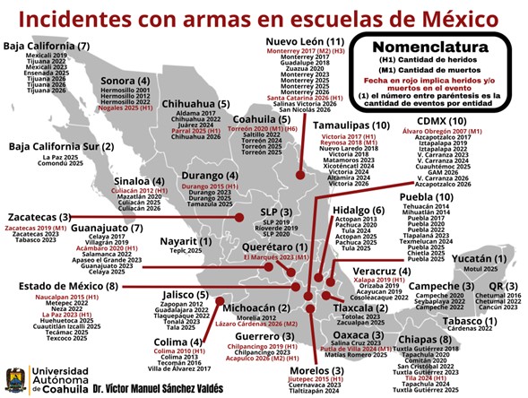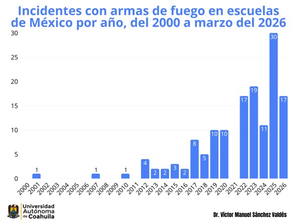 Como se puede observar, la cifra más alta de incidentes se presentó en 2025 con 30 casos, pero hay que advertir que apenas está comenzando abril y 2026 ya tiene 17 casos, por lo que, de seguir esa tendencia, el año actual se convertiría en el nuevo máximo histórico, lo cual debe ser una señal de alerta para las autoridades de seguridad y de educación en todos los niveles de gobierno.