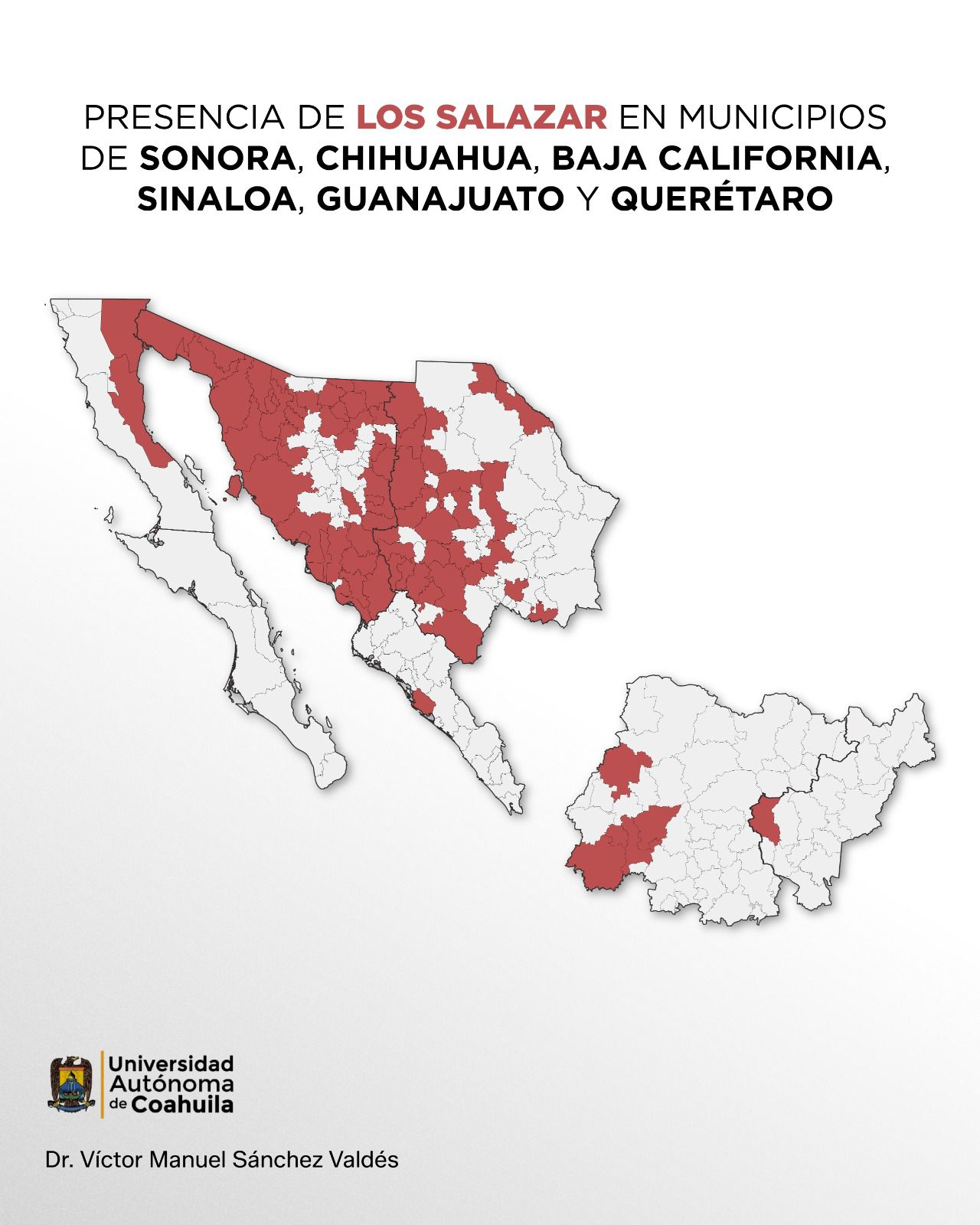 El territorio de los Salazar no es menor, tienen presencia en 81 municipios de 6 entidades federativas. En Sonora operan en 44 de los 72 municipios, en Chihuahua en 26 de los 67, en Guanajuato en 7 de los 46, en Baja California en 2 de los 7, en Querétaro en 1 de los 18, que es la capital y, por último, en Sinaloa en 1 de los 20, que es Navolato. En este enlace pueden tener acceso a las fuentes que soportan la presencia de la organización en cada uno de los 81 municipios.
