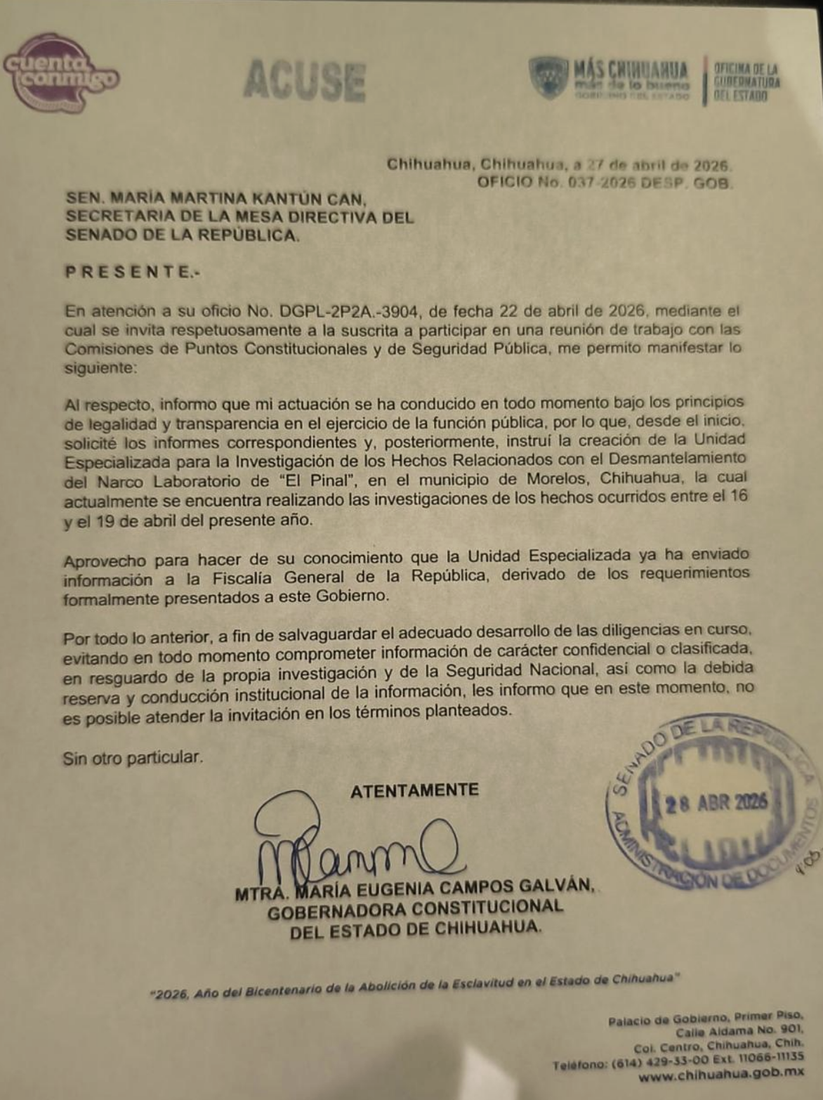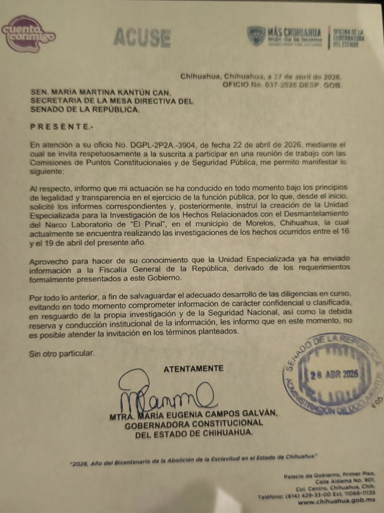 En un comunicado enviado al Senado, la mandataria de Chihuahua indicó que ya ha enviado a la Fiscalía General de la República la información que derivado de los requerimientos que se le solicitaron.